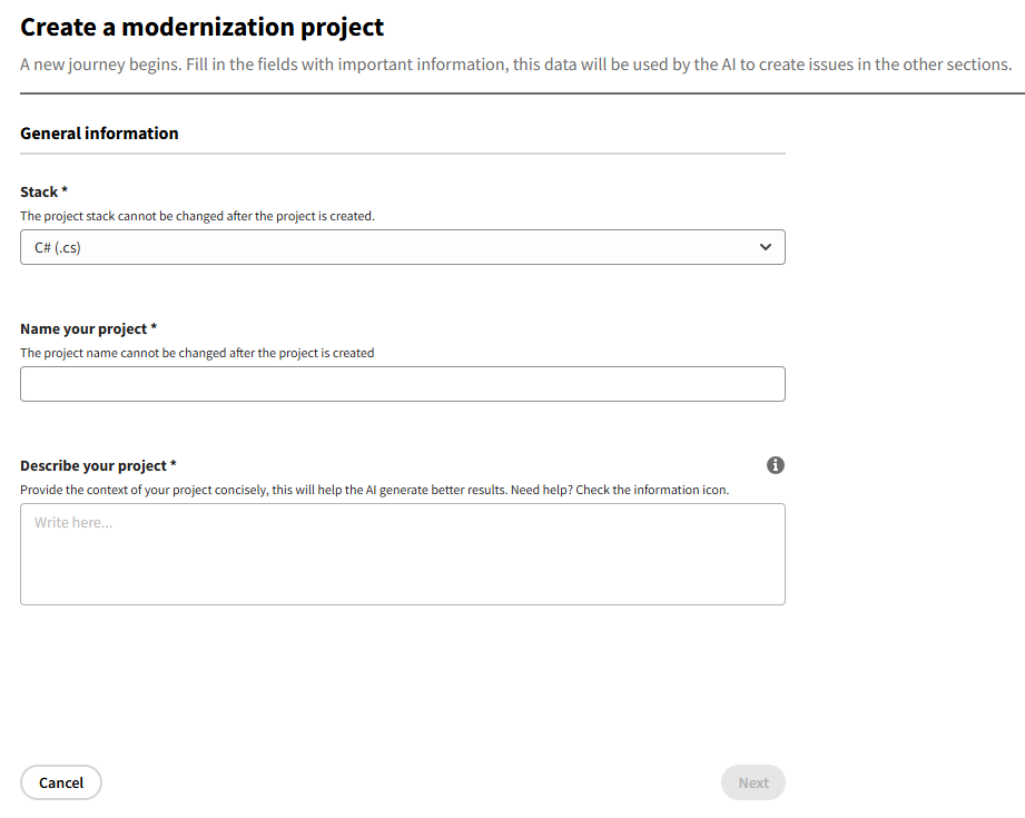 Starting a new modernization project is a straightforward process. This page guides you through the simple form to get your project set up.